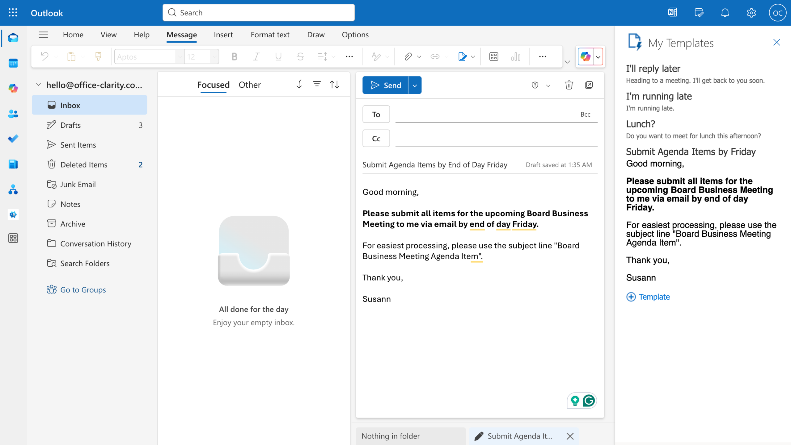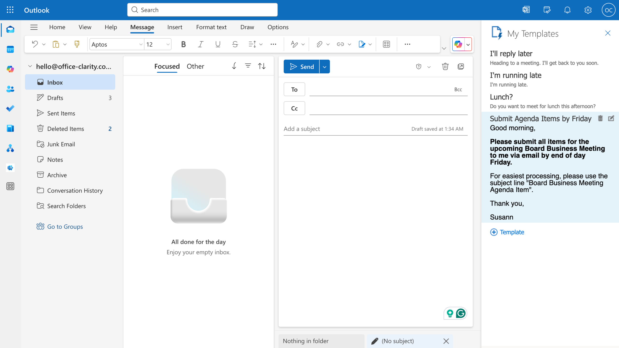 Maybe you’re thinking: “I already have templates saved in Word or Google Docs.” That’s awesome! But did you know you could even save yourself the step of copying and pasting those emails by creating a template email in Outlook?